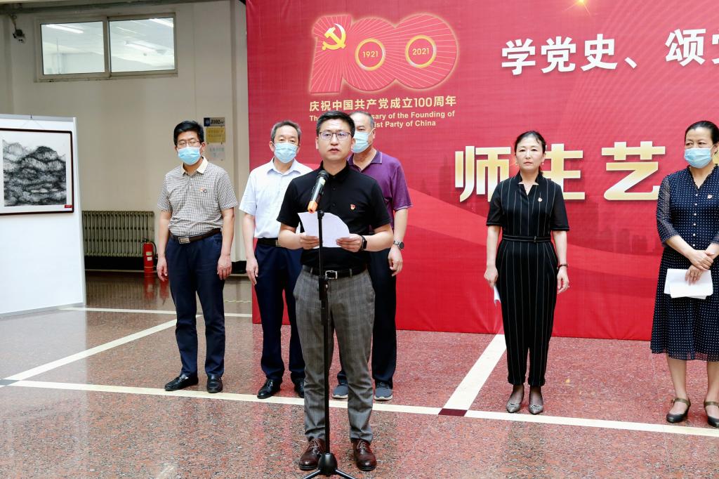 美術與藝術設計學院副院長孟德鴻教授代表參展作品創作者在開幕式上發言,他表示,作為新時代文藝工作者和教育者,我們將堅持黨的領導、心懷祖國人民、響應時代召喚、追求藝術理想,用手中的筆墨創作更多更好弘揚中國精神、凝聚中國力量、傳播先進文化的優秀作品,表達我們衷心熱愛黨、永遠跟黨走的堅定信心和堅強決心,用更多更好謳歌黨百年輝煌史的精品力作來傳承紅色基因,賡續紅色血脈,向中國共產黨成立100周年獻禮!