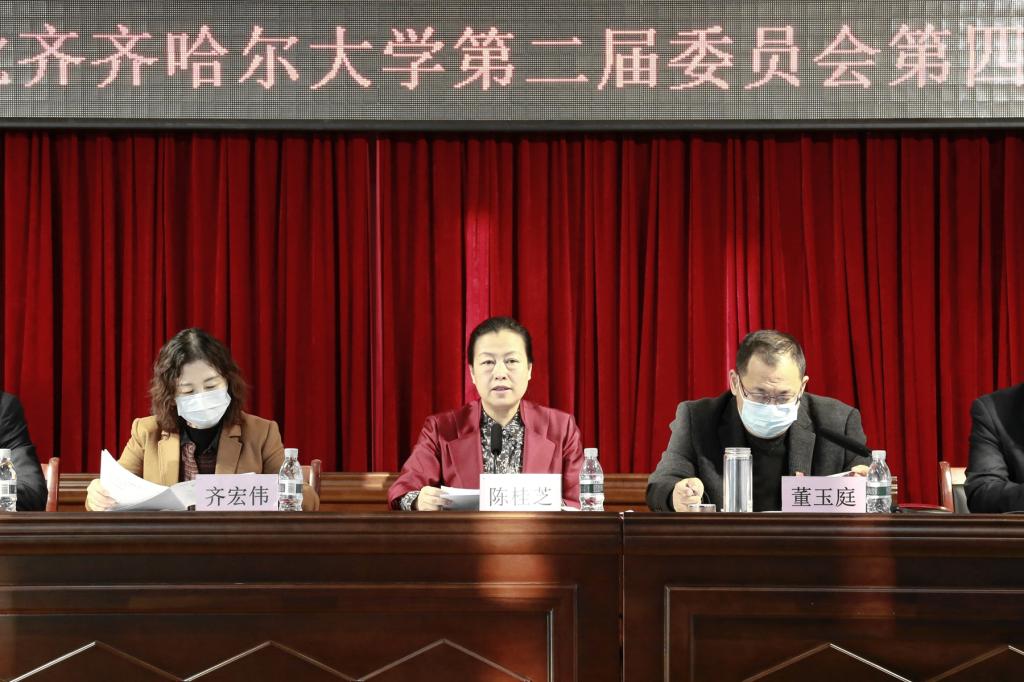 12月31上午,中共齊齊哈爾大學第二屆委員會第四次全體會議在求實樓五樓會議室舉行。會議聽取和審議了校黨委書記陳桂芝同志受黨委常委會委托作的年度工作報告,審議通過了《中共齊齊哈爾大學委員會常委會2021年抓黨的建設工作報告》(書面),審議通過了《中國共產黨齊齊哈爾大學第二屆委員會第四次全體會議決議(草案)》。