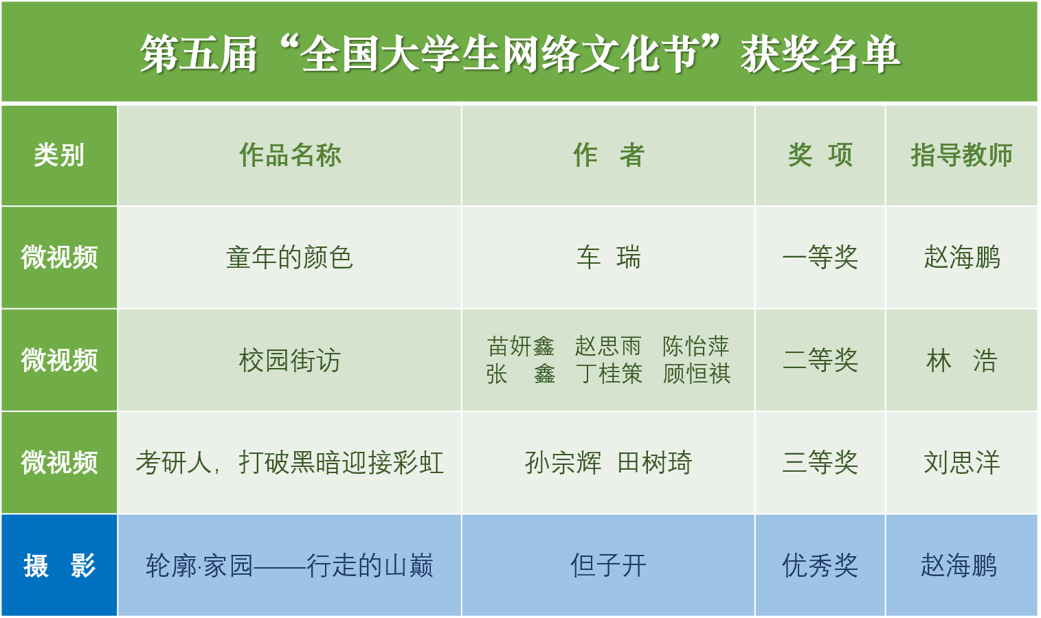 日前,教育部網(wǎng)站公布了第五屆“全國大學(xué)生網(wǎng)絡(luò)文化節(jié)”和“全國高校網(wǎng)絡(luò)教育優(yōu)秀作品推選展示活動”評選結(jié)果。我校車瑞等9名學(xué)生的三項作品分別獲得微視頻類一等獎、二等獎、三等獎各一項,但子開獲得攝影類優(yōu)秀獎。學(xué)校榮獲第五屆大學(xué)生網(wǎng)絡(luò)文化節(jié)優(yōu)秀組織獎。本次獲獎作品的等級和數(shù)量位居省內(nèi)高校前列,創(chuàng)歷史新高。
