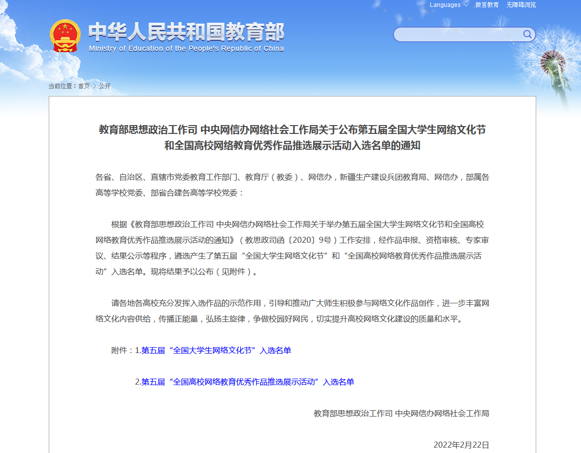 據(jù)悉,作為全國高校網(wǎng)絡(luò)思政領(lǐng)域最高級別競賽之一,第五屆“全國大學(xué)生網(wǎng)絡(luò)文化節(jié)”和“全國高校網(wǎng)絡(luò)教育優(yōu)秀作品推選展示活動”兩項活動共收到作品54822件,覆蓋全國31個省(區(qū)、市)和新疆生產(chǎn)建設(shè)兵團。網(wǎng)絡(luò)文化節(jié)征集作品類型包括微視頻、微電影、動漫、攝影、網(wǎng)文、公益廣告、音頻、校園歌曲、其他類網(wǎng)絡(luò)創(chuàng)新作品等9類。網(wǎng)絡(luò)教育優(yōu)秀作品包括優(yōu)秀網(wǎng)絡(luò)文章、優(yōu)秀工作案例、優(yōu)秀微課、優(yōu)秀新媒體作品等4類。此次,我校共推薦九類97個作品參賽。