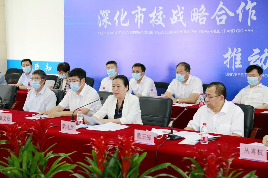 陳桂芝指出,今年是黨的二十大和省十三次黨代會勝利召開之年,我們的市校戰略合作有政策東風、有扎實基礎、有區域優勢、有應用場景,必定大有可為、未來可期。她強調,站在新的歷史發展和戰略合作起點上,齊大將深入貫徹落實習近平總書記重要指示批示精神和許勤書記、胡昌升省長到我市調研指示精神,堅持“資源共享、優勢互補、協調創新、發展共贏”的原則,聚焦齊齊哈爾市產業鏈供應鏈三年行動計劃,主動融入裝備制造、食品加工、生物和新能源4個“千字號”產業集群建設,推動數字經濟、生物經濟、冰雪經濟、創意設計“四新”經濟,賦能傳統優勢產業和戰略性新興產業,把握科技進步大方向、產業變革大趨勢、集聚人才大舉措,在更高維度、更大領域、更深層次推動市校合作,為新龍江、新鶴城振興發展貢獻更多的齊大智慧和力量。