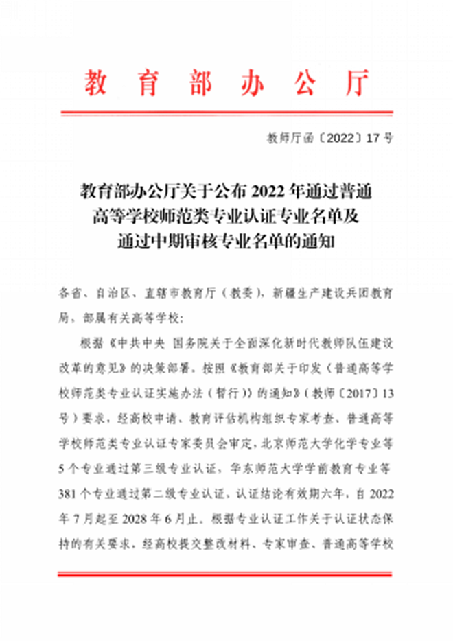 近日,教育部發布《教育部辦公廳關于公布2022年通過普通高等學校師范類專業認證專業名單及通過中期審核專業名單的通知》(教師廳函〔2022〕17號),公布了2022年通過普通高等學校師范類專業認證的專業名單。我校漢語言文學、英語、數學與應用數學3個專業通過了教育部師范類專業第二級認證,認證結論有效期為六年(2022年7月至2028年6月)。