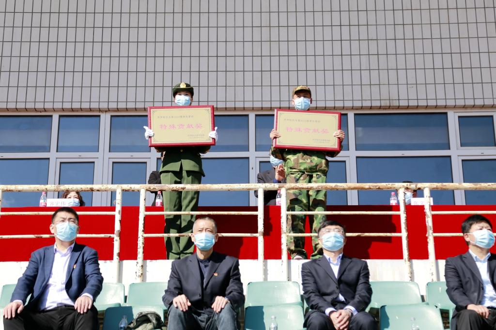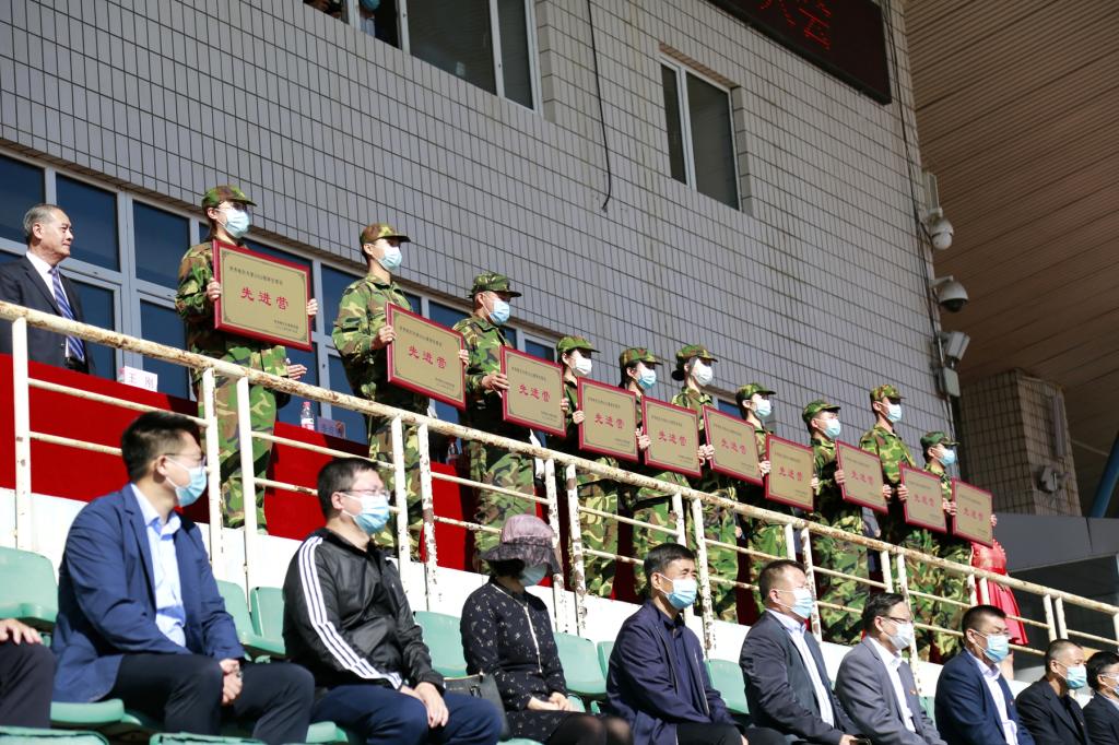 校工會主席陶佰睿宣讀了軍訓表彰名單,與會領導為榮獲先進營及特殊貢獻獎單位代表頒發(fā)了榮譽獎牌。隨后,參訓新生代表進行了精彩的軍訓匯報表演。