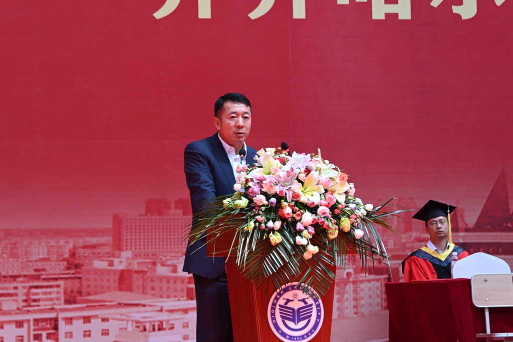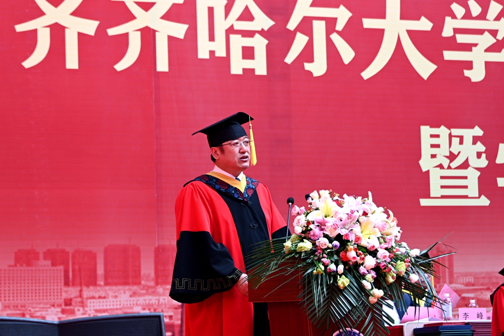 他說,“畢業”既標志著一段學習經歷的完結,也標志著人生新的征程的開啟。回首往昔,你們在齊大度過了一段極不平凡的青春歲月,在美麗的環湖大學,度過了最美的青春時光。特別是你們在學校,學習生活期間,克服了疫情影響,圓滿完成了學業,以各方面的優異表現,交上了一份完美的畢業答卷。你們彰顯著齊大學子的家國情懷和赤子之心,傳遞了齊大正能量和好聲音。母校為你們點贊,向你們致敬!作為校長,我為大家圓滿完成學業感到由衷地高興,更對同學們的美好未來充滿著期待!臨別之際,我對同學們提出四點希望和囑托:一是希望你們樹立遠大理想,堅定信仰信念;二是希望你們心懷“國之大者”,擔當時代責任;三是希望你們堅持吃苦耐勞,始終砥身礪行;四是希望你們保持永久奮斗,投身強國偉業。