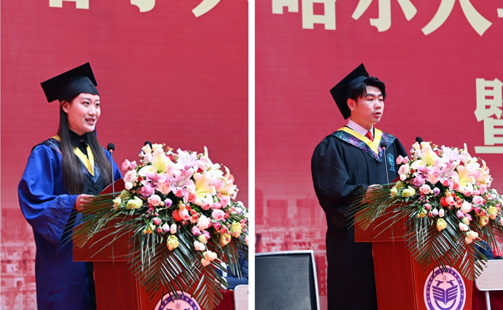 來自材料科學與工程學院的潘昊鑫同學、輕工與紡織學院的孫玉棟同學分別代表研究生畢業生、本科生畢業生發言