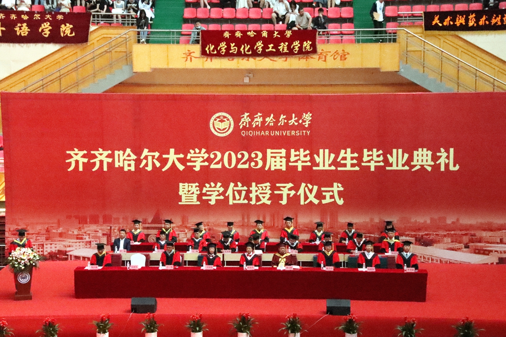 6月14日上午,齊齊哈爾大學2023屆學生畢業典禮暨學位授予儀式在校體育館隆重舉行,校領導陳桂芝、董玉庭、齊宏偉、張文治、王剛、叢喜權、張樹軍、李奇楠、陶佰睿出席典禮,學校學位評定委員會成員、工業分析專業1995屆校友李峰、學生家長代表、2023屆優秀畢業生代表和在校師生代表共同參加了此次盛典。畢業典禮由副校長王剛主持。