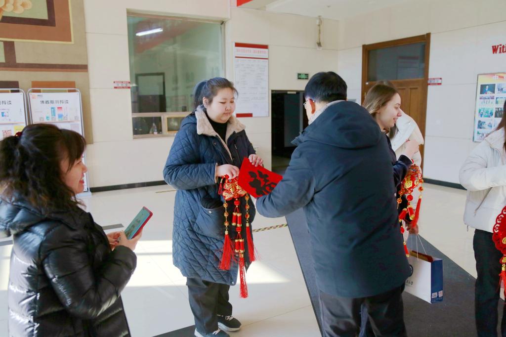 在德潤大廈一樓大廳,郝文斌走進留學(xué)生中間為大家添喜送福,關(guān)切詢問家庭狀況,對留校的國際師生表達了節(jié)日的祝福和深切的問候,并為大家發(fā)放了新春大禮包。同時,他叮囑同學(xué)們合理安排時間,注意假期安全,充分利用在龍江過龍年的寶貴契機,進一步感受中華優(yōu)秀傳統(tǒng)文化的魅力。希望同學(xué)們成為促進中外交流的橋梁紐帶,為中外友好合作交流做出新的貢獻。郝文斌表示,“每逢佳節(jié)倍思親。”龍是中華民族的圖騰,象征著奮進騰飛,吉祥如意。辭舊迎新之際,學(xué)校將更加關(guān)心關(guān)愛在校學(xué)生。祝大家龍行龘龘、前程朤朤、生活??,在新的一年里扎根齊大沃土取得可喜成績。