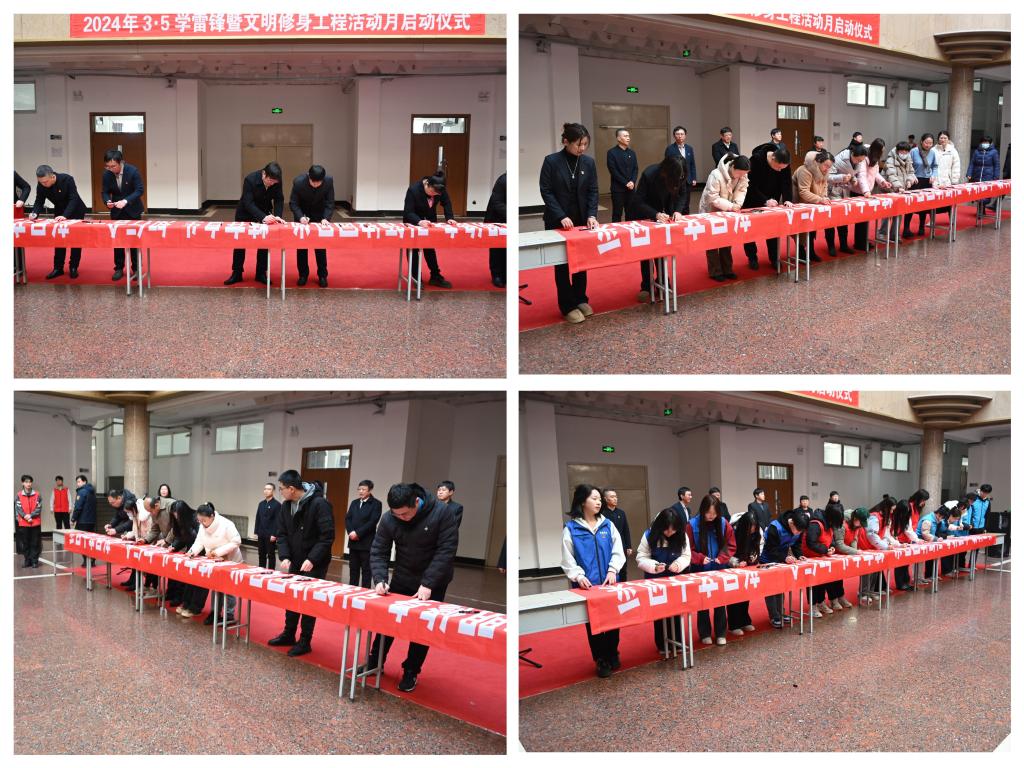 隨后,與會師生在印有文明標語的條幅上簽名,承諾將以實際行動踐行雷鋒精神,共同推動文明修身工程。