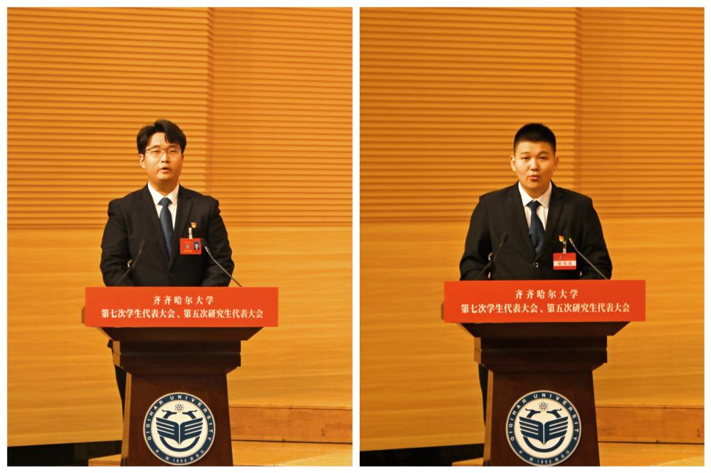 校學(xué)生會(huì)執(zhí)行主席孔繁碩代表第六屆學(xué)生會(huì)委員會(huì)在大會(huì)第一次全體會(huì)議上作學(xué)生會(huì)工作報(bào)告,校研究生會(huì)執(zhí)行主席滕菲代表第四屆學(xué)生會(huì)委員會(huì)在大會(huì)第一次全體會(huì)議上作研究生會(huì)工作報(bào)告。