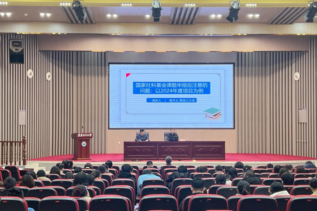 動員會后,我校邀請國內(nèi)知名社科專家,黑龍江大學(xué)新質(zhì)生產(chǎn)力研究院院長、龍江學(xué)者焦方義教授,為我校教師就國家社科基金項目申報進(jìn)行專場輔導(dǎo)。