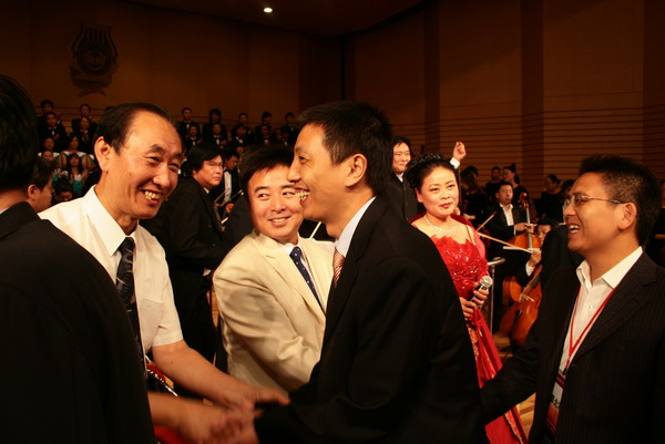 在全場觀眾的掌聲與喝彩聲中,音樂會圓滿結(jié)束,出席音樂會的評估專家與校領(lǐng)導(dǎo)登臺與演職人員一一握手并致以親切的慰問。