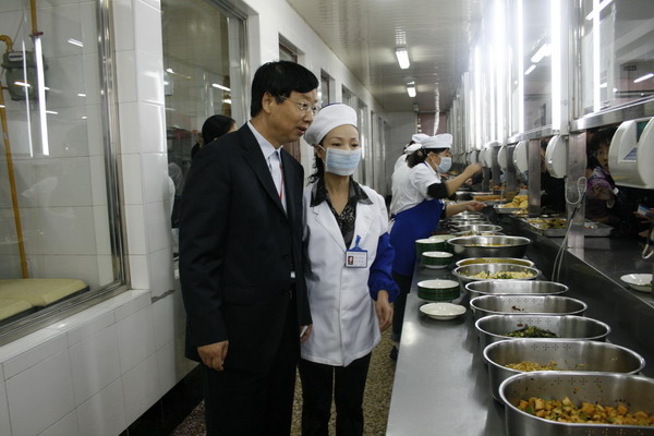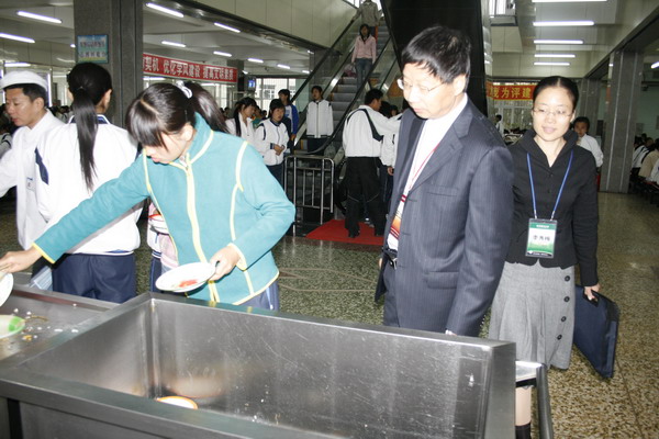 7時,王立新教授來到東區二食堂,考察了餐飲服務設施,詢問了學生的飲食情況,并與就餐學生進行了交流。
