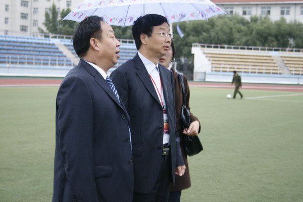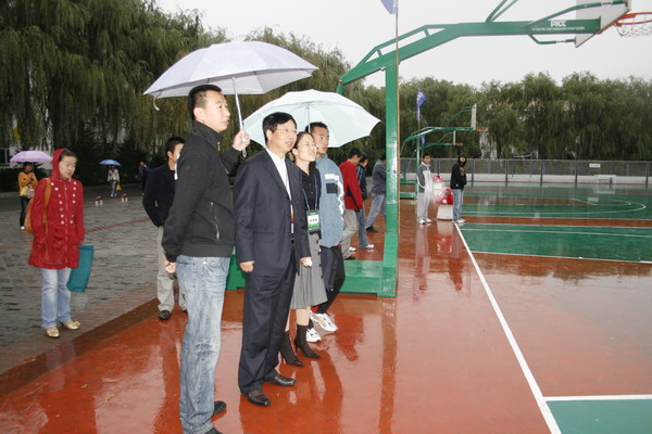 9月26日6時30分,評估專家王立新教授來到我校西區體育場和中區籃球場考察學生晨練活動。