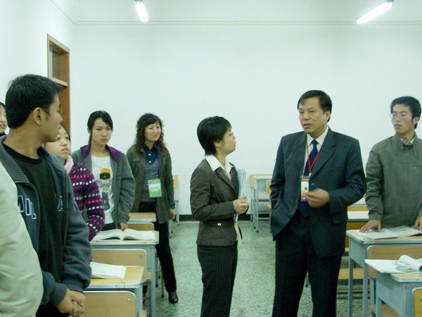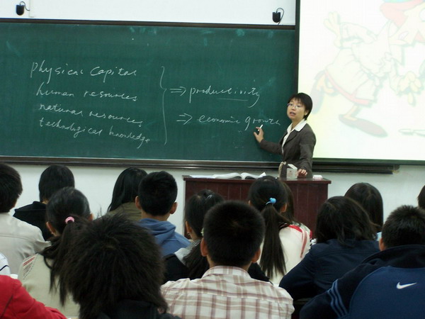 9月26日上午8時,評估專家章躍教授冒雨來到1教431教室,深入宏觀經濟學雙語教學課堂聽課。章躍教授來到課堂后,與任課教師經濟貿易系講師王愛紅進行了簡短交流,并查閱了《宏觀經濟學》課程的教材、教學大綱、授課計劃和教案等教學資料。