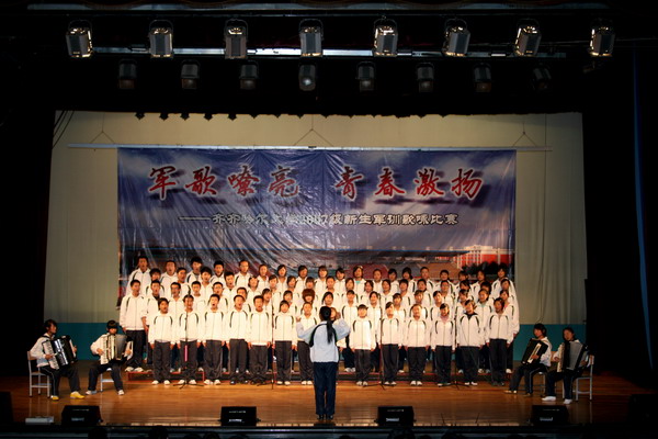 學(xué)子放歌,喜迎國慶。9月26日下午2:00,我校2007級軍訓(xùn)新生在學(xué)校文化宮內(nèi)舉行了主題為“軍歌嘹亮 青春激揚”的軍訓(xùn)歌詠比賽,喜迎建國58周年。校黨委副書記王鳳琴與參訓(xùn)師生一起觀看了比賽。