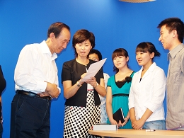 敬一丹饒有興致地觀摩了正在進行實訓活動的新聞學專業學生的播音主持訓練,并現場進行了指導。在場的教育與傳媒學院學生就新聞工作者的職責、傳媒產業的發展前景、新聞學專業學生應如何鍛煉和提高自己等問題與敬一丹進行了廣泛的交流,許多學生請敬老師簽名并合影留念,現場氣氛熱烈、活躍。李虹院長代表全院師生,向她贈送了學生自己制作的敬一丹節目專輯和學生社會實踐活動視頻集錦。敬一丹對我校的學生實踐活動和實驗室建設給予了較高評價,并欣然題寫了“祝福未來的同行”贈送給教育與傳媒學院的全體師生。