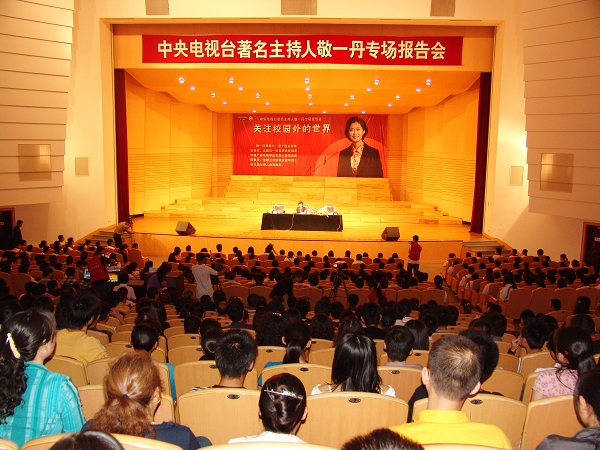 下午14時整,“關注校園外的世界”——央視著名主持人敬一丹專場報告會在我校音樂廳隆重舉行。校領導唱江華、史鐵成、王鳳琴、張學軍、曲偉建、姜守訓、張忠恒、鄧啟剛、呂曉輝等出席了報告會。報告會由校黨委副書記王鳳琴主持。