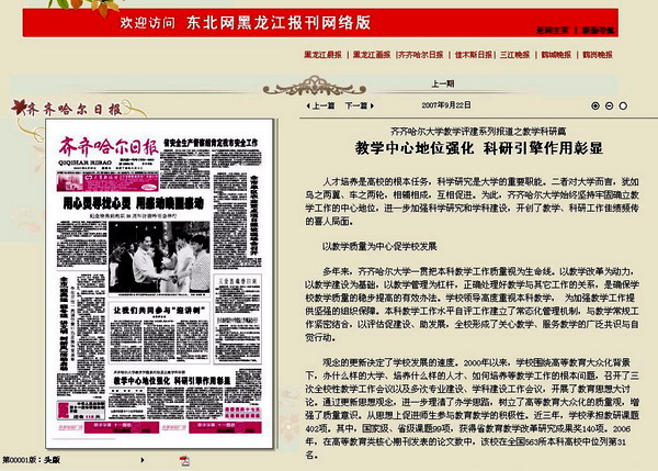 編者按:9月22日,《齊齊哈爾日報》第一版刊發“齊齊哈爾大學教學評建系列報道之教學科研篇”:“教學中心地位強化 科研引擎作用彰顯”。