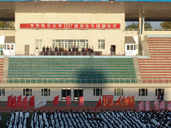 由39名軍訓(xùn)教官組成的儀仗隊(duì)、護(hù)旗手邁著整齊的步伐護(hù)送國(guó)旗到升旗臺(tái)前。莊嚴(yán)激越的國(guó)歌聲中,身著整齊服裝的同學(xué)們行注目禮,注視著國(guó)旗冉冉升起在齊齊哈爾大學(xué)校園的上空。