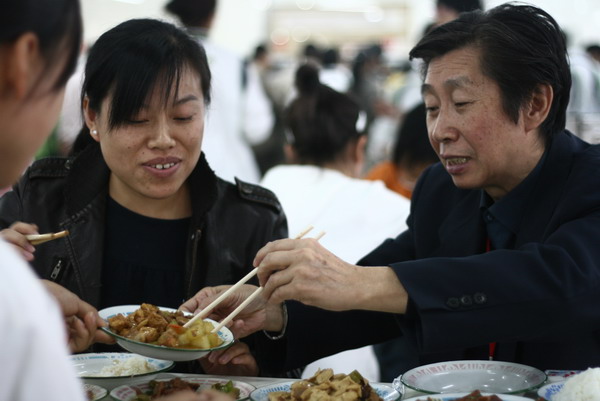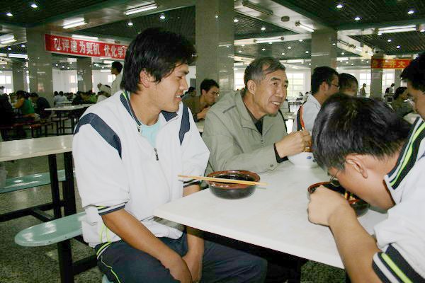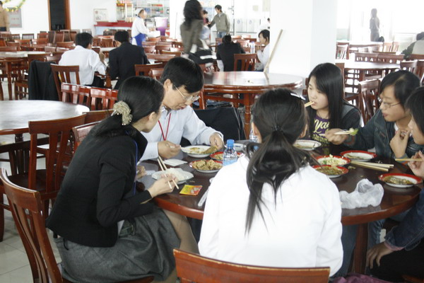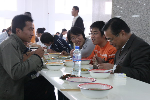 當學生們看到專家也來到餐廳就餐時,都抱以微笑,并主動向專家問好。專家們邊吃邊和同學們親切交談,了解他們的學習、家庭、生活等情況。