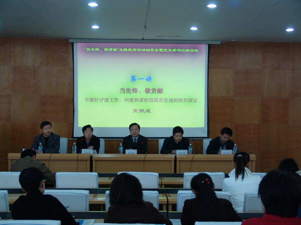 校黨委副書記史鐵成在會議上作了題為“當先鋒,做貢獻,為做好評建工作、構建和諧校園提供堅強的組織保證”的講話,就基層黨組織建設在學校建設、尤其是評建工作和構建和諧校園工作中的重要作用強調指出,全校各級黨組織應明確任務和使命,當先鋒,做貢獻,充分發揮黨支部的戰斗堡壘作用和黨員的先鋒模范作用;努力學習,開拓進取,不斷提高理論素質和業務素質,為學校迎評促建提供堅強的組織保證。