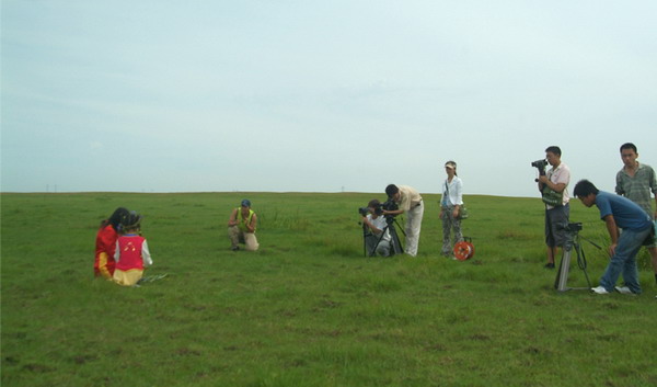 8月11日,是他們開機拍攝的第一天。他們早早地起床,驅車一多個小時才到達第一個拍攝景點,對莫日根姐姐進行拍攝。為了攝取更多、更好的畫面,他們常常奔波在幾個景點之間。有時,也會為景點的選取進行反復地討論。攝制組師生深知光線選擇對于攝影作品的重要性,于是他們在光線的選擇上很下工夫。每天10點半以后光線太強就不適合外景拍攝了,他們就把拍攝時間選在早晨和下午,把晚上和中午的時間用來策劃和制作。每天早上4點起床,他們就一直要工作到晚上12點才能睡下。中午,實在困極了,就在車上或者簡陋的會議室里躺一會兒。