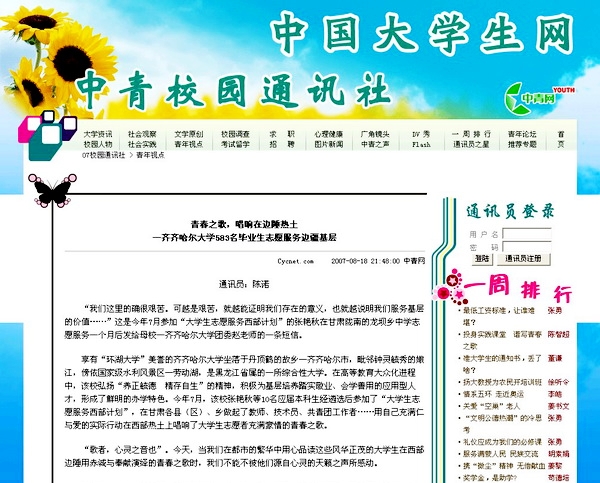 8月18日21:40,中央八家重點新聞宣傳網站之一、目前國內最大的青少年門戶網站—中青網以《青春之歌,唱響在邊陲熱土—齊齊哈爾大學583名畢業生志愿服務邊疆基層》為醒目標題,對我校“583名畢業生志愿服務邊疆基層著華章”的感人事跡給予了熱忱報道,現予轉載。