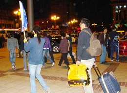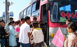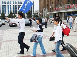 在火車站迎新接待點(diǎn),我校工作人員按照學(xué)校的統(tǒng)一要求和部署,及時(shí)為剛剛走下火車的新生及家長提供周到而細(xì)致的服務(wù)。他們有的舉著寫有各院系標(biāo)志的牌子為新生及家長引路;有的為新生提供細(xì)致的咨詢,有的幫他們拿東西,有的為遠(yuǎn)道而來的學(xué)生家長排憂解難,停放在廣場上的接送班車,為一路旅途奔波勞累的新生和家長提供免費(fèi)服務(wù),將他們順利送達(dá)學(xué)校。