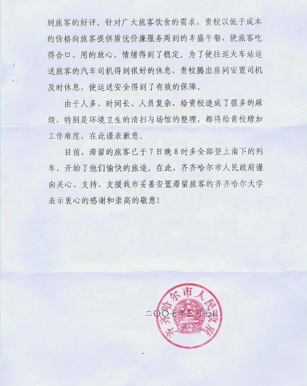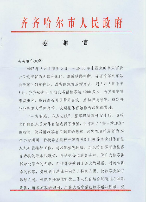 3月14日,齊齊哈爾市人民政府向我校發來感謝信函,對我校在3月5日——7日妥善安置因風雪滯留在齊站旅客的行為“表示衷心的感謝和崇高的敬意!” “一方有難,八方支援。”在這場突如其來的旅客滯留事件發生后,我校體育館被市政府緊急會議確定為旅客疏散地。