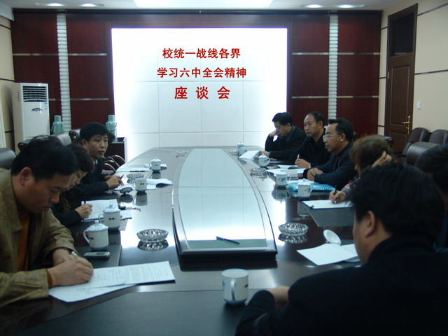 11月3日,校黨委統戰部在行政辦公樓五樓會議室召開民主黨派、僑聯、無黨派人士學習中共十六屆六中全會精神座談會。校黨委統戰部長李敏義、市農工民主黨副主委、校農工民主黨主委鄭永杰,市九三學社常委、校九三學社主委宋波,市民革常委、校民革主委邱玉興,市政協常委、無黨派代表人士趙欣,省政協委員、校政協活動組組長邱松,校僑聯主席胡秀華、副主席堵秀鳳,民盟委員會組織委員張良祥等出席了座談會。座談會由校黨委統戰部副部長田志峰主持。
