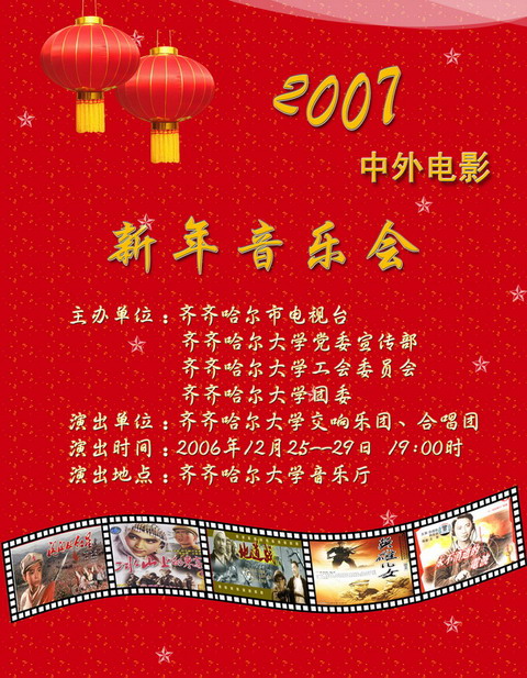 根據演出日程安排,2007新年音樂會將于2006年12月25日-29日在我校音樂廳連續演出5場。