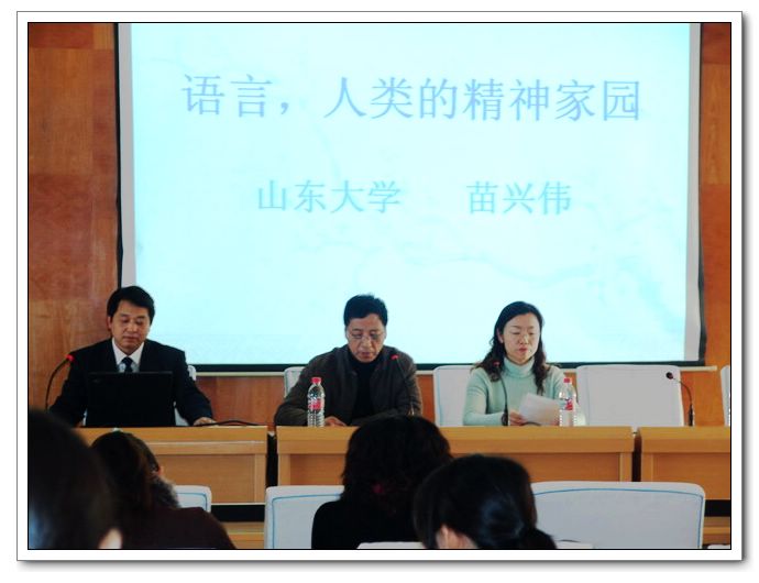 在講座中,苗興偉教授緊緊圍繞“語言:人類的精神家園”這個中心主題展開,闡述了“語言是人類的精神家園,語言通過它所蘊含的人文精神負載著人類的精神世界,呵護著人類的精神生活,培育了人類對人生、世界的審美觀照的態度、高尚的道德品質和積極向上的人生觀和世界觀。”的鮮明學術觀點,并分別從“語言的人文性、語言對人文精神的順應、樂觀原則支配下的語用”和“人文精神的隱喻積淀”等層面做了重點、詳盡的闡述,并運用多媒體演示課件輔助了講座內容,收到了較好的效果。