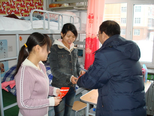 2月17日上午,校學生處副處長吳寶柱與學生資助科科長張培華、舍務科科長王國義、學生資助科李靜等帶著省教育廳和學校領導的親切囑托來到18#、19#學生公寓,看望、慰問在春節期間留校度寒假的大學生并為他們發放了慰問金。