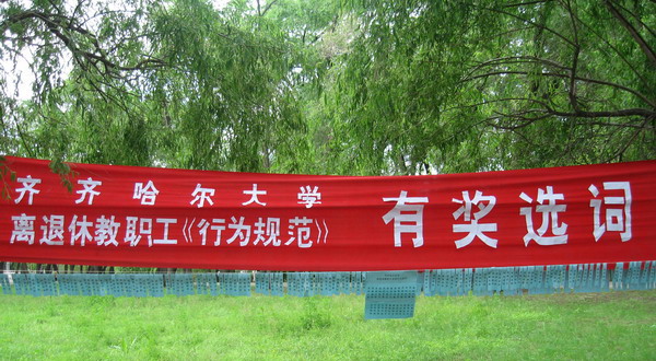 “老有所學(xué),關(guān)心國(guó)事,崇尚科學(xué),思想常新,理想永存;老有所教,愛(ài)國(guó)守法,明禮誠(chéng)信,團(tuán)結(jié)友善,保持晚節(jié).......”6月20日上午,我校幾百名離退休教職工歡聚在龍沙公園,一邊欣賞著《齊齊哈爾大學(xué)離退休教職工行為規(guī)范》條幅,一邊誦讀著《離退休教職工行為規(guī)范》中喜歡的詞語(yǔ),這是我校離退休教職工凝煉“文明行為規(guī)范”活動(dòng)的序幕。