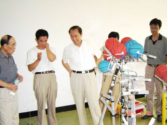 唱江華校長認真地觀看了我校同學研制的參賽機器人的模擬表演,并就有關問題與計算機與控制工程學院院長戴學豐等指導教師和參賽同學交換了意見。唱江華校長關切地詢問參賽師生的學習和生活,親切地與參賽同學進行交談,并代表學校對他們表示親切的慰問。他勉勵參賽師生在比賽中取得優異賽績,為校爭光。