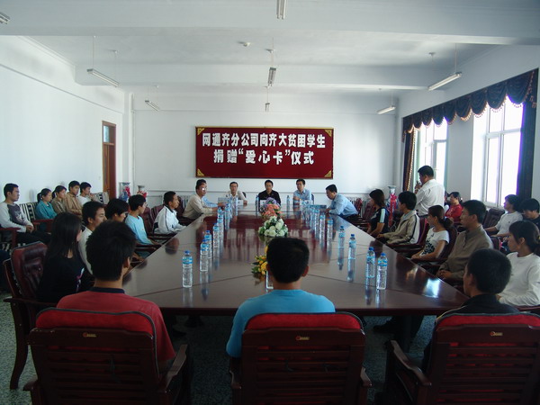 9月14日下午1時(shí),中國(guó)網(wǎng)通齊齊哈爾分公司向貧困學(xué)生捐贈(zèng)"愛(ài)心卡"的儀式在我校西區(qū)主樓606會(huì)議室舉行。齊齊哈爾通信分公司副總經(jīng)理李巖、齊齊哈爾通信分公司瀏園分局局長(zhǎng)劉松濤、副局長(zhǎng)高宏偉、閆偉,我校學(xué)生處處長(zhǎng)王剛、副處長(zhǎng)吳寶柱及相關(guān)工作人員與來(lái)自各學(xué)院的30名貧困生代表參加了儀式。