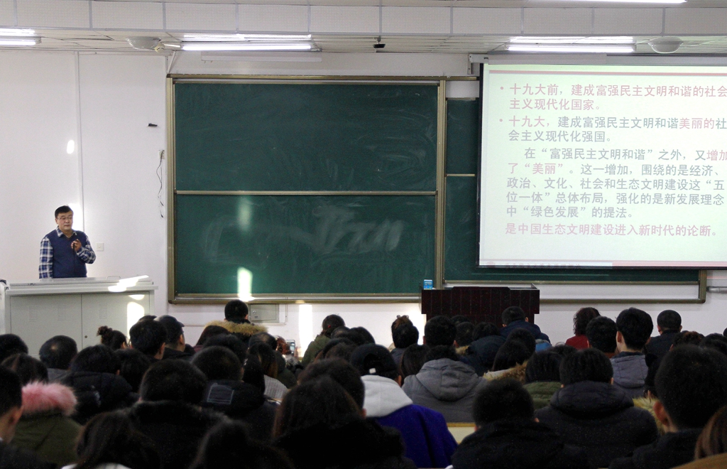 在西區1教階梯202教室,校黨的十九大精神宣講團成員、馬克思主義學院馬克思主義基本原理教研部主任、博士、碩士生導師王圣禎教授以《認真學習黨的十九大生態文明新思想 奮力譜寫美麗中國的龍江華章》為題,從生態文明建設新時代的新矛盾與新目標、生態文明建設新時代的新使命、奮力譜寫美麗中國的龍江華章、美麗中國與大學生的歷史擔當等方面進行了解讀。他指出,實現美麗中國偉大夢想,一要戰勝生態挑戰的偉大斗爭,二要建設生態馬克思主義政黨的偉大工程,三要推進中國特色社會主義生態文明建設偉大事業。緊密結合省情,在立足得天獨厚的龍江自然資源優勢中搶占綠色發展制高點,促進綠色發展。建設美麗中國更需要大學生的歷史擔當。建筑與土木工程學院、機電工程學院全體教職工、學生黨員及入黨積極分子參加了宣講活動。