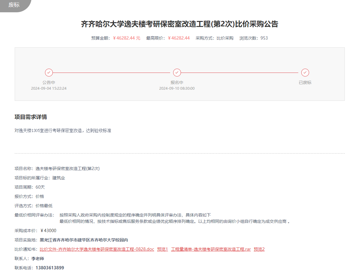 上一條:齊齊哈爾大學(xué)逸夫樓考研保密室改造工程(第3次)比價(jià)采購公告(轉(zhuǎn)自黑龍江省政府采購網(wǎng))