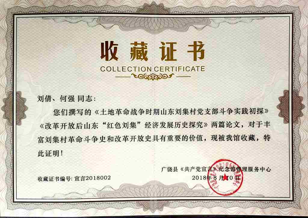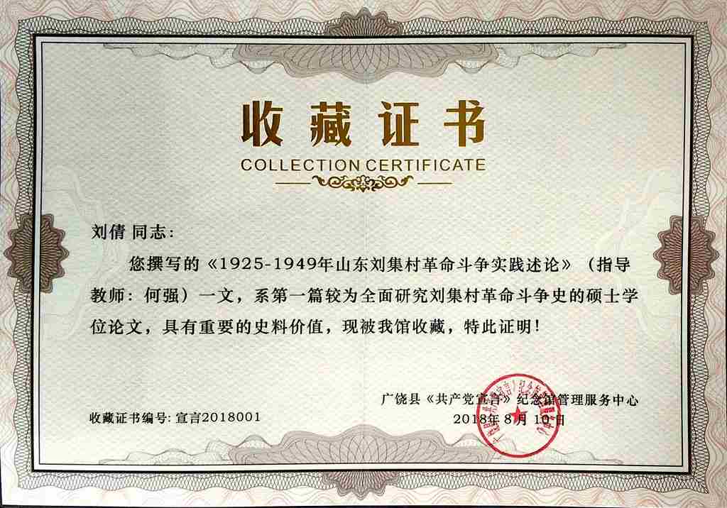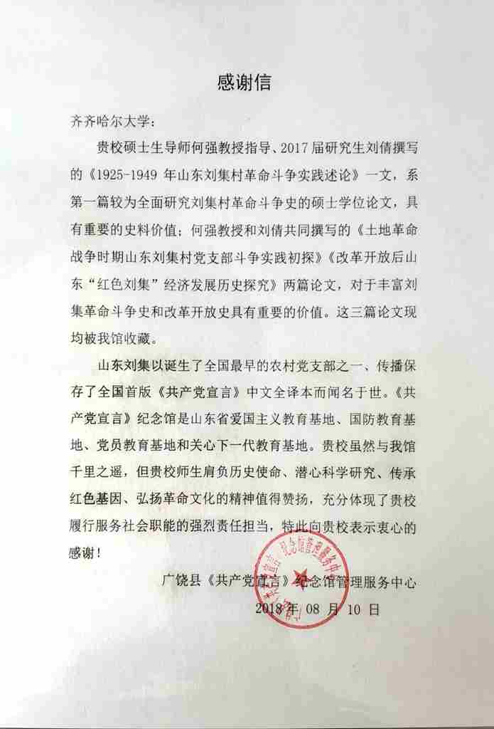 發布日期:2018-09-30 點擊量:潛心深研紅色歷史,服務社會再立新功。 近日,文學與歷史文化學院收到來自山東省廣饒《共產黨宣言》紀念館寄來的感謝信。該館在感謝信中稱,由碩士生導師何強教授指導、2017屆碩士研究生劉倩撰寫的題為《1925-1949年山東劉集村革命斗爭實踐述論》一文,系第一篇較為全面研究劉集村革命斗爭史的碩士學位論文,具有重要的史料價值。該碩士論文與劉倩和何強教授共同撰寫的題為《土地革命戰爭時期山東劉集村黨支部斗爭實踐初探》《改革開放后山東“紅色劉集”經濟發展歷史探究》兩篇學術論文,共計三篇論文被該館收藏。