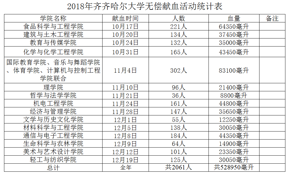 累計無償獻血人數共計2061人,采集血量528950毫升。2018年我校學生采血人數和采血量再創新高,是我校近年來采血人數和采血量最高的一年。