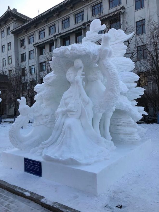 在眾多的藝術創作隊伍中,來自全國各地高校的大學生創作團體引人注目。2019年1月4日—7日,第十一屆國際大學生雪雕比賽在哈爾濱工程大學舉行,來自中國、俄羅斯、英國、丹麥、泰國等國家和地區的55支隊伍參加了這次比賽。在這些來自世界各地的參賽隊伍中有一支隊伍很出色,這就是我們的齊齊哈爾大學代表隊。在這次比賽中,我們學校的參賽作品《絲綢古韻—明月千里寄相思》榮獲了一等獎和最佳技巧獎。