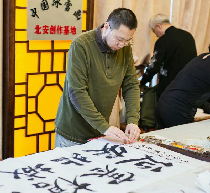 在北安市,小分隊成員抵達后,不顧旅途勞頓就立即投入到活動中來。當晚,在北安文化藝術(shù)基地舉行了文學、美術(shù)、書法、攝影筆會,藝術(shù)家們揮毫潑墨,滿懷激情地繪就了一幅幅充滿吉祥福意的書畫作品,吸引了當?shù)乇姸鄲酆谜咔皝韺W習交流。大家表示,這樣近距離地和來自省城的大藝術(shù)家們面對面學習交流,太難得了!