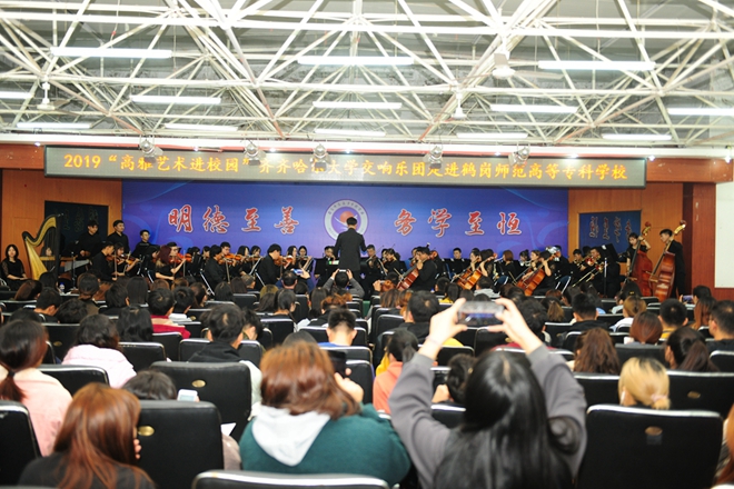 在“不忘初心、牢記使命”主題教育深入開展之際,10月14日至18日,受黑龍江省教育廳、文化和旅游廳、財政廳的委托,我校黨委宣傳部副部長何強,音樂與舞蹈學院副院長殷進良,帶領齊齊哈爾大學交響樂團70余名師生,赴鶴崗師范高等專科學校、黑龍江冰雪體育職業學院、哈爾濱應用職業技術學院、哈爾濱科學技術職業學院,開展了四場“高雅藝術進校園”專場演出,受到四所高校2000余名師生的熱烈歡迎和高度贊譽。