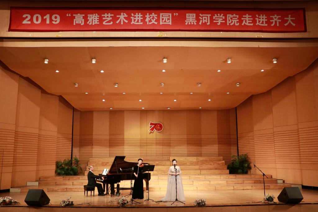 10月23日19時,2019年“高雅藝術進校園”黑河學院專場演出在我校音樂廳隆重舉行。黑河學院工會副主席盧麗艷、音樂學院院長徐衛,我校宣傳部、工會、團委、音樂與舞蹈學院的領導與1000余名師生觀看了演出。