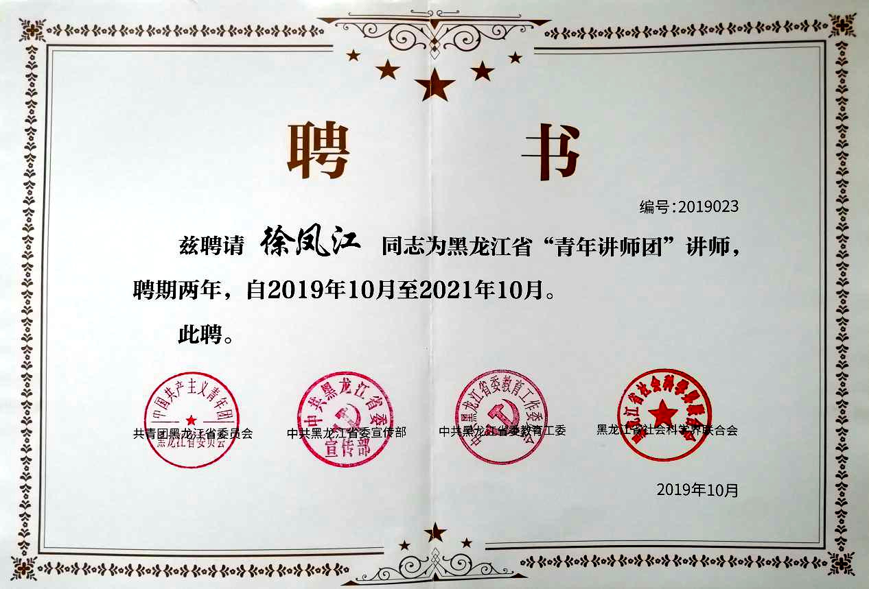 經過嚴格的資格遴選,我校學校辦公室副主任徐鳳江副教授入選,并參加集中培訓,通過驗收。近日,徐鳳江正式被團省委、省委宣傳部、省委教育工委、省社科聯聘為黑龍江省“青年講師團”講師。