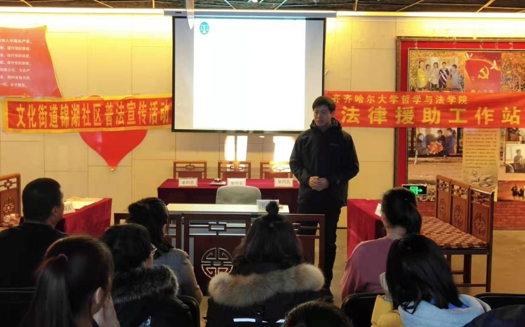 11月20日,學院“模擬法庭”走進錦湖社區,為社區群眾展示了一堂生動的普法宣傳教育課。“模擬法庭”成員全部由學院法律援助工作站學生組成,開啟了學生服務社會普法宣傳教育的新篇章。