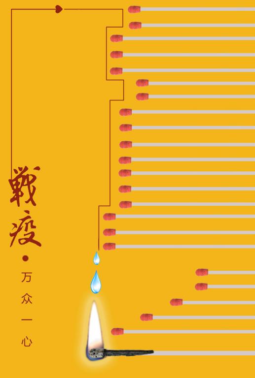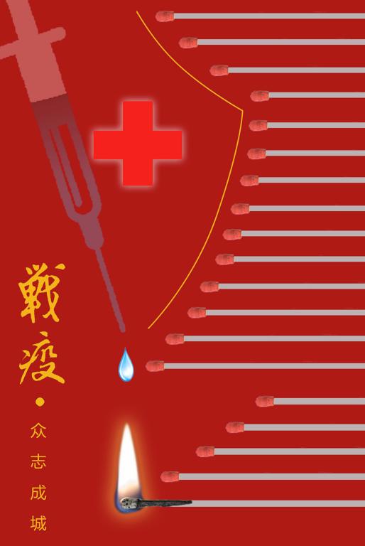 《戰(zhàn)疫》招貼 徐長春 設(shè)計(jì)說明:用火柴的易燃性代表病毒易傳染,通過火柴組合構(gòu)成注射器和盾牌的部分形體,來表達(dá)治療、隔離和防護(hù)的方法和過程以及隔離的重要性。