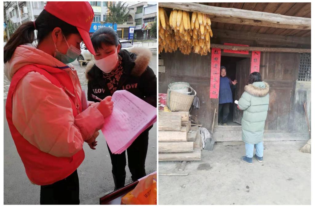 3-周霜同學為進村村民進行體溫測量和登記 4-何先群同學進村入戶為村民科普宣傳防疫