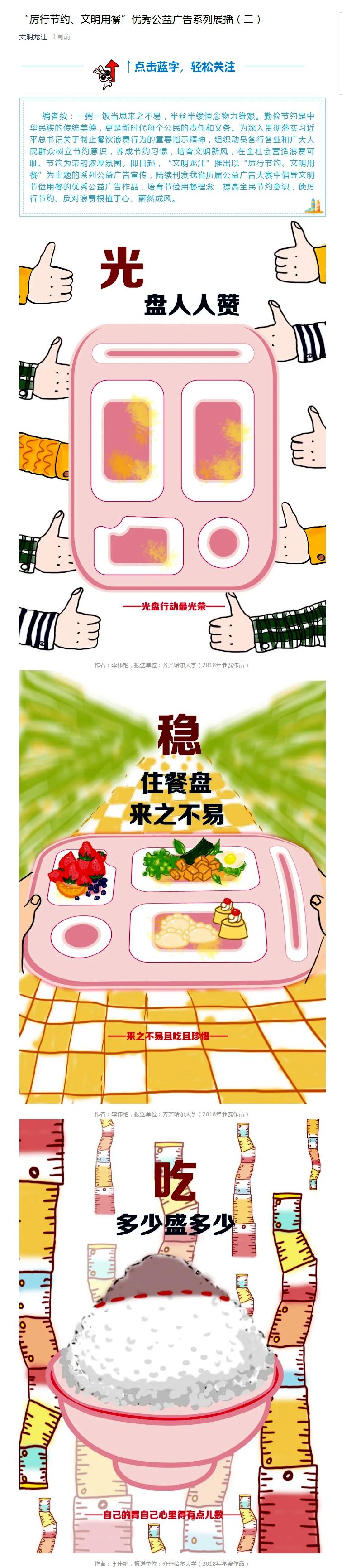 文明校園樹新風,節儉教育結碩果。在全省“文明健康 有你有我”公益廣告優秀作品征集活動中,我校24項作品入選并被省文明辦“文明龍江”公眾號宣傳推廣;9月1日,省文明辦“厲行節約、文明用餐”系列優秀公益廣告宣傳展播,再次推廣了我校的3件優秀入選作品。