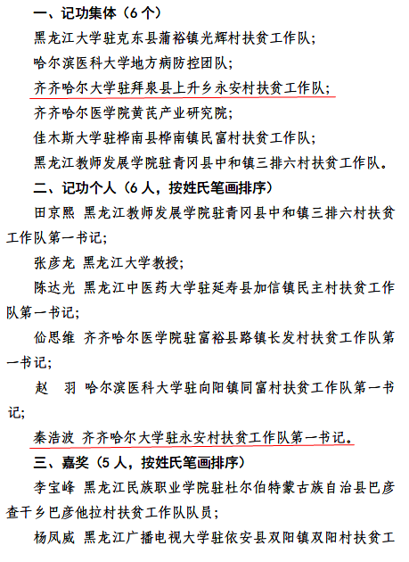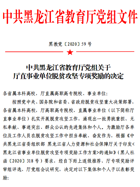為激勵(lì)駐村工作人員在脫貧攻堅(jiān)工作中擔(dān)當(dāng)奉獻(xiàn)、奮發(fā)作為,根據(jù)《中共黑龍江省委組織部黑龍江省人力資源和社會(huì)保障廳關(guān)于印發(fā)<黑龍江省事業(yè)單位脫貧攻堅(jiān)專項(xiàng)獎(jiǎng)勵(lì)工作方案>的通知》(黑人社函〔2020〕318號)要求,12月14日,省教育廳黨組印發(fā)了《中共黑龍江省教育廳黨組關(guān)于廳直事業(yè)單位脫貧攻堅(jiān)專項(xiàng)獎(jiǎng)勵(lì)的決定》(黑教黨〔2020〕59號),我校駐拜泉縣上升鄉(xiāng)永安村扶貧工作隊(duì)榮獲記功集體,我校駐永安村扶貧工作隊(duì)第一書記秦浩波同志榮獲記功個(gè)人。